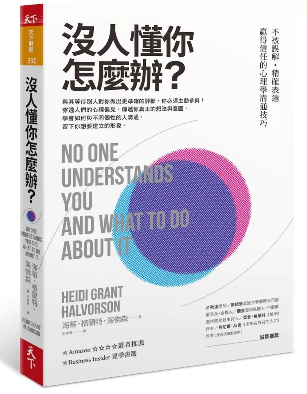 哥倫比亞大學商學院動機科學研究中心副主任海蒂.海佛森在新作《沒人懂你怎麼辦?》中,以認知科學的架構讓我們了解,每個人其實都不知不覺帶著微妙的偏見在互動,別人扭曲對我們的看法,我們也不見得公平地看待他人。而且接收訊息時大量倚賴既定印象,懶得多想,以致誤會橫生,在生活或職場上不時遭逢困頓。
